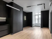 Das Interieur verwendet matte Texturen, kontrastierende Akzente und mehrstufige Beleuchtung. In der Wohnung im Flur eine große geräumige Garderobe mit einem Spiegel mit Touch-Beleuchtung.