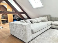 3. Ebene: Eine Lounge-Zone mit vielfältigen Nutzungsmöglichkeiten – sie kann als Relax-Bereich, Fitnessraum, zusätzliches Schlafzimmer oder Arbeitszimmer genutzt werden. Derzeit ist sie mit einer Sitzecke, einer maßgefertigten Sauna und Fitnessgeräten ausgestattet. Zudem gibt es ein eigenes Badezimmer mit Dusche und Toilette.