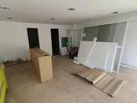 The area is around 80 m2. There is a large terrace in front, main room, a bathroom, an office and another storage room.