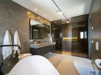 Das Hauptschlafzimmer verfügt über einen großen begehbaren Schrank und ein luxuriöses Badezimmer. Tiefentöne und exquisite Materialien verleihen einem zeitgenössischen Charme. Im Obergeschoss befindet sich ein Solarium - ein ruhiger Ort, um die Landschaft zu genießen und Gäste zu unterhalten.