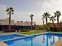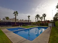 Geräumige, moderne Doppelhaushälfte mit 2 Schlafzimmern und großem Garten am Pool in Villamartin. Geräumige Doppelhaushälfte im Erdgeschoss mit 2 Schlafzimmern im modernen Stil in Villamartín. Dieses Haus mit großem Eckgarten und mehreren Terrassen verfügt über Gemeinschaftsparkplätze, einen privaten Parkplatz auf dem Grundstück und ein großes Solarium mit Panoramablick. Liegt direkt neben den Gärten und dem Gemeinschaftspool in einer geschlossenen Wohnanlage. Das private Grundstück ist teilweise mit Kunstrasen bedeckt, nach Südwesten ausgerichtet, mit einer Vielzahl mediterraner Pflanzen und einer hohen Mauer, die Privatsphäre bietet. Es verfügt außerdem über eine angenehme Nachtbeleuchtung, mehrere Markisen zum Schutz vor Sonne und Gartenmöbeln sowie einen Außenabstellraum für Gartenmöbel und Fahrräder. Ein weiterer Abstellraum dient für den Warmwasserbereiter und die Waschmaschine. Über die Außentreppe gelangen Sie zum 20 m2 großen Solarium mit Blick auf den Gemeinschaftspool. Der Eingang zum Haus erfolgt durch das Wohn-Esszimmer mit offener Küche. Inklusive Haushaltsgeräten, Möbeln und Klimaanlage im gesamten Haus.Wenige Gehminuten zum Einkaufszentrum La Fuente mit Geschäften, Restaurants, Supermärkten, Tankstelle und anderen Dienstleistungen.