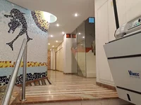 Wenn wir das Gebäude betreten, werden wir von einem schönen Eingang mit Mosaikfliesen verziert begrüßt, und das Gebäude hat ein Sicherheitssystem. Eine Küche mit einem Waschraum öffnet sich vor uns. Die Küche verfügt über eine Schiebetür, um Platz zu sparen.