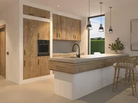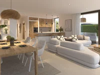 Im Inneren bietet die Villa einen hellen und geräumigen Wohn-Essbereich mit direktem Zugang zu den Außenterrassen und dem nach Süden ausgerichteten Swimmingpool, sodass Sie den ganzen Tag über die Sonne genießen können. Die moderne, offene Küche ist komplett ausgestattet und wird durch einen angrenzenden Waschraum und eine Gästetoilette ergänzt.