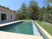 Die Eingangsetagen verfügen über eine offene Küche mit hohen Decken und großen doppelt verglasten Fenstern. Der geräumige Wohnbereich ist mit einem steinverkleideten Kamin ausgestattet und bietet einen Blick auf den Pool und den Wald. Auf dieser Etage befinden sich auch 3 Schlafzimmer, 1 Bad en-suite und ein halbes Bad. Die untere Etage bietet direkten Zugang zu einem überdachten Parkplatz. Im Obergeschoss befindet sich ein Schlafzimmer mit eigenem Bad, Ankleidebereich und Abstellraum.