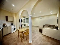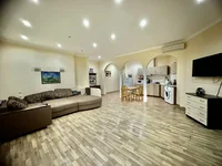 Großes, geräumiges Wohnzimmer, Schlafzimmer und Küche mit Möbeln und Geräten.