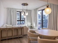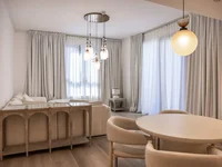 Das Apartment verfügt über eine geräumige offene Küche und einen Wohnbereich mit einem komfortablen Sofa und einer Lounge-Zone – ideal für entspannende oder unterhaltsame. Ein separates Schlafzimmer sorgt für Privatsphäre und Ruhe und macht das Layout ideal für den Alltag und den Urlaub.