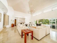 Upon entering you are greeted with impressive royal palm trees and a water feature wall that intrigues guests to find out what is hidden behind. As you walk around, a large open living room welcomes you, equipped with a professional bar and high ceilings perfect for entertaining guests. The airconditioned living room acts as the center point of the villa, allowing free movement throughout and connecting the family room with the home theater, the master bedroom with private office, 5 guest bedrooms and a fully equipped Italian kitchen with a very ample service/laundry area.
