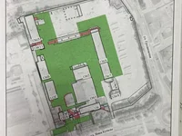 Complejo de edificios de capital en asfalto y territorio vallado con conveniente ubicación y caminos de acceso