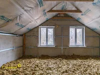 La parcela es de 7,72 acres, cercada por vecinos, desde el lado de la carretera se llena una base de hormigón para la valla. Ventanas de PVC, puerta frontal de metal. Los árboles de abedul crecen en el sitio.
