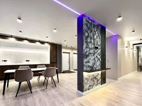 Apartamento con plan gratuito: dormitorio aislado y amplio salón de cocina. En la cocina hay un grupo de comedor compuesto por una mesa y seis sillas suaves. Cocina con accesorios de alta calidad y fachadas de toque suave nanoplástico.