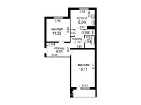 Diseño racional: habitaciones aisladas, ventanas con vistas a los lados opuestos de la casa, un baño separado, una amplia cocina de 9 metros cuadrados. La superficie total del apartamento en el SNB es de 57 metros cuadrados. m, superficie habitable - 30,36 metros cuadrados. m.