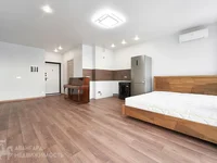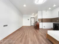 El apartamento fue reparado en tonos neutros modernos. Las paredes están alineadas y pintadas, en el suelo hay una tabla de parqué, un techo de estiramiento, varios modos de iluminación. Hay una zona de cocina con un delantal en la pared. Hay un refrigerador, lavadora y una cama doble grande con un cómodo colchón.