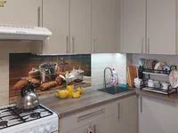 La cocina tiene un amplio conjunto de cocina ergonómica con un sistema de almacenamiento reflexivo.