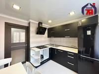 La cocina tiene un auricular moderno: hay una capucha, panel de cocina incorporado, muchos lugares de almacenamiento; el techo de revestimiento con lámparas incorporadas, en los azulejos del suelo - práctico y limpio.