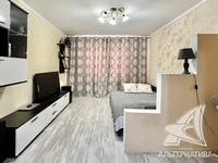 Apartamento de 1 dormitorio, Brest, Ryabinovaya str., 2013, 9 / 10 panel, 44.5 / 42.0 / 17.0 / 10.3, baño separado, loggia acristalada, doble acristalamiento, puertas interiores - MDF, techos de estiramiento combinados (2.64 mlon, brillo), suelos - baldosas (en la cocina, en la loggia) y laminado, paredes pegadas con papel pintado, imitación del baño moderno Juego de cocina, el resto por acuerdo. El apartamento está bien renovado. Todas las ventanas dan al patio. Un vestíbulo para dos apartamentos. Entrada limpia. Un pasajero. En el patio hay un parque infantil, estacionamiento para coches. Una zona con infraestructura desarrollada. A poca distancia de paradas de transporte público, escuelas, jardines, tiendas. Mira más de cerca.