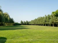 El jardín orientado al este tiene un garaje individual para 1 vehículo, un taller de 110 my sup2; con autolift y espacio para aprox. 9 vehículos, un estanque de natación de 25 x 4 m, una casa de la piscina con terraza cubierta, una cocina, una zona de estar, una ducha y un aseo. También hay una sauna en el sótano de la casa de la piscina.