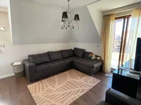 The penthouse includes terrace furniture consisting of chairs and a table, as well as decorative interior elements. It is equipped with sofas, a dining table with chairs, a TV, a spacious kitchen, a wardrobe, and a king-size bed in the bedroom. All furniture remains in place, and the penthouse is fully equipped.