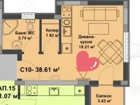 The layout includes a spacious room with a kitchen and living area, a bathroom, and a balcony overlooking the well-maintained grounds of the residential complex.
