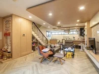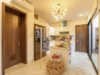 Inside, the villa welcomes you with a spacious receiving area fitted with centralized air conditioning, perfect for entertaining guests. The modern kitchen is thoughtfully designed with an island counter and has direct access to an atrium-style rear space—featuring potted greenery and a functional area for laundry. The kitchen comes fully equipped with a microwave, oven, cooker, range hood, sink, and pantry, all seamlessly built into the utility counter for convenience and efficiency.