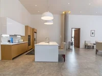 Wide lounge and dining hall, naturally lit by floor-to-ceiling windows