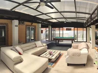 Es una propiedad grande que se divide en cuatro apartamentos de dos pisos con el mismo diseño, y tienen una parte central común que está destinada a socializar y tiene una salida a través de paredes de vidrio en dos lados a un hermoso jardín ajardinado.