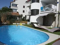 Los paneles solares en el techo proporcionan calefacción de agua eficiente en energía. La propiedad incluye dos piscinas, una piscina más pequeña exclusivamente para el apartamento en planta baja y una piscina compartida más grande para todos los demás apartamentos. En la sección izquierda del jardín, hay una cocina de verano con terraza cubierta y zona de barbacoa, ideal para reuniones al aire libre y disfrute de los huéspedes.