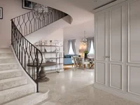 En la planta baja hay una cómoda sala de estar con innumerables detalles hermosos y muebles de alta calidad con una adición especial de cortinas de diseño Dedar de Milán. Usted puede preparar una de las delicias más deliciosas para su familia y amigos en una cocina moderna y totalmente equipada con electrodomésticos y equipos de alta calidad y estándares firmados por fabricantes y diseñadores mundialmente famosos.