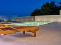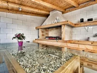 La casa tiene una gran piscina, y la vista desde la terraza se extiende sobre Rijeka, Krk, Cres, hasta Istria.
