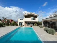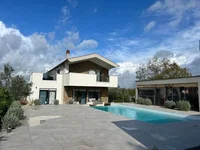 Amplia y moderna villa en Marcana completada en 2022 con elementos de piedra Istria tradicionales en diseño exterior.