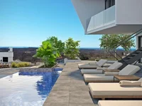 La espaciosa sala de salón abierto está situada en la planta baja, y se complementa con un elegante comedor y una cocina de primera clase, que, además de la escalera interna, también está conectada al espacio exterior por una escalera externa. La planta baja contiene un dormitorio con su propio vestidor y baño, un gimnasio con equipo de fitness profesional y una zona de relajación con sauna, que están conectados por un baño, una habitación para el equipo y una lavandería. Además de la funcionalidad, la planificación extremadamente profesional presta especial atención a los límites entre interior y exterior, y debido al terreno de cascada, se ha logrado una comunicación ideal entre el jardín y la villa. En la planta baja hay una piscina climatizada con una zona de tomar el sol desde la cual las escaleras bajan al segundo nivel donde hay una zona de parrilla.