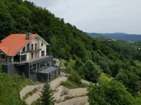 En la segunda planta, hay tres dormitorios con sus propios baños. Además de que la posición de esta lujosa villa y la vista desde la terraza son impresionantes a primera vista, un parque infantil, una pista de bocce y su propio mini helipad también han encontrado su lugar en el jardín. Al pie de la propiedad hay una casa de huéspedes con dos garajes, un sótano y un apartamento en la primera planta. La villa fue construida con materiales de calidad, calefacción por suelo radiante fue instalada en todo el edificio con preparación para una bomba de calor y secadores de pelo en cada habitación.