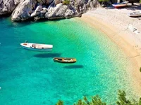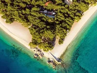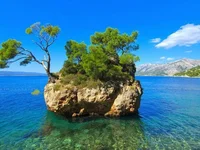 La famosa playa de Punta Rata con su llamativa "piedra breljan" en el mar es una de las playas más bellas de Croacia y una característica de esta región turística.