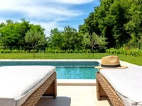 The landscaped yard, enhanced with a 40 m² swimming pool and sun deck, offers complete harmony.