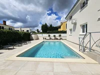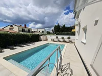 La villa se encuentra en tierra con un total de 739m2, después de deducir el espacio ocupado por la villa y sus contenidos adicionales, usted tiene un cómodo 601m2 yarda a su disposición. En la parte delantera, hay suficiente espacio de estacionamiento para 6 coches, que puede ser cubierto si es necesario por los futuros propietarios. Una parte más privada del jardín se encuentra en la parte trasera de la villa, donde la parte central está ocupada por una piscina de 4mX10m con un banco de masajes, más frío y agua salada (sistema de electrólisis). Junto a la piscina hay una terraza cubierta de verano con una mesa de comedor de madera más grande y una cocina de verano con parrilla. El patio de la villa está completamente cercado y es seguro para el juego sin preocupaciones y diversión de los miembros más jóvenes de su familia y mascotas. Es un jardín que no requiere demasiado mantenimiento, lo que hace la estancia significativamente más agradable y simple. El sistema de riego automático se encarga de su vegetación y plantas mediterráneas, lo que crea un ambiente especial durante su estancia en el aire libre.