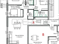 Istria, Rovinj: A three-bedroom apartment is for sale on the ground floor of a residential building under construction, Apartment A. The living area is 104.40 m², and with the terraces, the total area is 109 m². The apartment consists of an entrance hall of 9.35 m², a living room with a kitchen of 35.03 m², a utility room of 3.33 m², a hallway of 5.37 m², three bedrooms of 10.65 m², 13.35 m², and 15.82 m², and two bathrooms, each of 5.75 m². Additionally, the apartment has two terraces of 13.65 m² and 4.12 m².