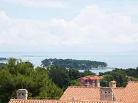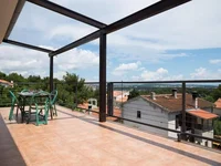 Una escalera en la sala de estar asciende a la segunda planta, que alberga tres dormitorios de tamaño generoso y una terraza más grande que ofrece una impresionante vista panorámica del mar y las islas Kvarner. Además, esta planta incluye dos baños. Para mayor privacidad, los dormitorios se pueden acceder no sólo desde el salón sino también a través de una escalera externa.