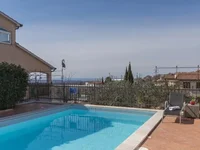 En la parte principal de la casa entra a través de un pasillo que conduce directamente a un pequeño baño, izquierda a las escaleras a la planta superior y derecha a un gran salón con chimenea y comedor con mesa grande y sillas, mientras que una hermosa cocina tiene acceso a una terraza cerrada. En frente de la terraza hay una gran piscina con sillas de cubierta y una chimenea para barbacoa. El techo de la planta baja está decorado con vigas de madera, y las paredes están forradas con piedra de Istrian.