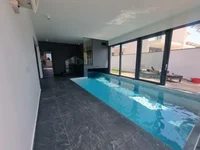 La villa se extiende a través de la planta baja donde hay una cocina con un comedor y un salón, una habitación adicional con un baño que está destinado para el entretenimiento, pero también se puede utilizar como dormitorio. Desde la sala de estar, se puede entrar a través de una pared de vidrio en la zona SPA, donde hay una piscina cubierta (27m2) con un jacuzzi y una sauna. En los meses de verano en la zona de spa hay una posibilidad de abrir las paredes de vidrio.