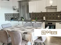 En la primera planta, en la planta baja, hay un apartamento de 85 m2 que consta de un baño, aseo, dos dormitorios, cocina con comedor y sala de estar con salida a una terraza de 30 m2. En la terraza de la planta baja hay un comedor exterior con una parrilla cubierta con canopy de madera.