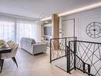 Dentro de un edificio de diseño moderno, el apartamento se extiende sobre la planta baja y la primera planta. El apartamento tiene una superficie total de aproximadamente 118 m2. Esta zona incluye una sala de estar y cocina, 3 dormitorios, 3 baños, y 2 terrazas. Además, el establecimiento cuenta con sauna y gimnasio. El interior excepcionalmente bien mantenido y lujosamente amueblado de la propiedad está equipado con una amplia gama de electrodomésticos modernos. Una característica particularmente encantadora de este apartamento es la hermosa zona al aire libre, que incluye una piscina, cubierta solar y una cocina de verano. El apartamento también incluye un estacionamiento designado para dos coches.