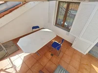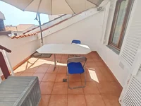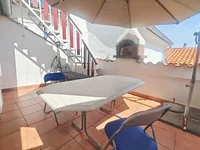 La planta baja consta de un salón, una cocina con comedor, un baño y un trastero con acceso al sótano. La primera planta cuenta con dos dormitorios, un segundo baño, y un pasillo. El ático alto se organiza como un salón de planta abierta con zona de cocina y acceso a una amplia terraza equipada con barbacoa. Una escalera externa conduce a una segunda terraza en la azotea, ideal para relajarse y socializar al aire libre.