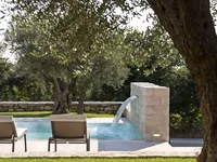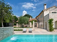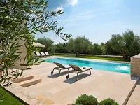 En el exterior, la propiedad es absolutamente encantadora. Todo el jardín está cercado por un muro tradicional de piedra y hermoso paisaje con plantas mediterráneas, vegetación madura y seis olivos antiguos que se estiman alrededor de 250 años. En el centro de este sereno espacio exterior se encuentra una generosa piscina de 55 m2 con una terraza para tomar el sol pavimentada en auténtica piedra de Istria, un lugar idílico para días de verano lentos.