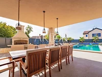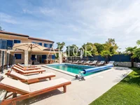 The outdoor area with a 32 m2 heated swimming pool and sunbathing area is surrounded by greenery and Mediterranean plants. It also includes a children's playground, a lounge area with a barbecue and an outdoor dining area, perfect for relaxation and family gatherings.