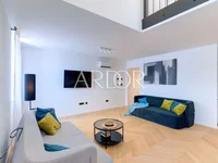 This duplex apartment is located on the 2nd floor and in the high attic, with a total living area of 133 m². It consists of an entrance hall, a spacious living room, a dining room and a fully equipped open-concept kitchen, one bedroom and a bathroom on the lower floor. On the upper floor there are two additional bedrooms and a spacious bathroom.