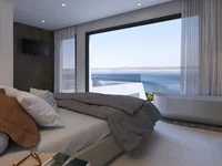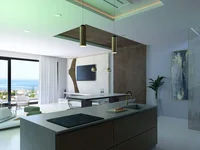 The ground floor offers an additional bedroom, a modern bathroom, a spacious living room with panoramic views and access to the balcony, and a fully equipped kitchen with a dining area.