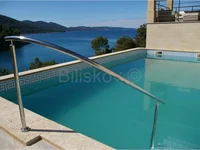 KORCULA, LADO NORTE - villa moderna de nueva construcción con piscina en primera fila al mar con litera para un barco. La superficie habitable de la villa es de 289 m2 y fue construida en una parcela de 748 m2. En la planta baja hay una sala de estar con baño, un área total de 45 m2, que está diseñada como una sala de estar adicional durante la estancia junto a la piscina y frente a la cual hay una meseta solar, Una gran terraza con pabellón y piscina. En la planta baja de 94m2 hay una cocina con comedor, sala de estar separada por una pared de vidrio de una gran terraza de 47m2, baño y despensa. En el 1er. Piso de 150m2 hay un amplio hall de entrada y 4 dormitorios, cada uno con baño. La villa está muy bien construida y equipada con muebles y electrodomésticos de alta calidad. El puesto ofrece privacidad absoluta y está ubicado en una bahía tranquila.