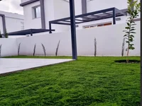 Jardín privado con césped artificial, árboles recién plantados, pergola y un almacén externo