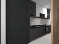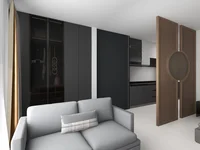 The studio apartment offers an efficient open-plan layout designed to maximize space and natural light. A cozy living area seamlessly transitions into a compact dining and sleeping zone, complemented by a fully equipped modern kitchen. Large windows enhance brightness and create an inviting, airy atmosphere.
