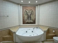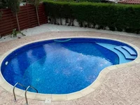 The yard is paved with cobblestones, featuring a pool (about 32 m²), covered parking, and a well. The plot is well-maintained, landscaped with mature plants (palms), and fully fenced. The driveway is asphalted.
