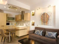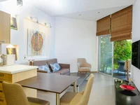 For sale 2 bedroom cozy apartment with a garden and a private pool, located in a gated complex right on the seashore. The apartment is fully furnished and equipped with household appliances. Air conditioners are installed. The complex has an additional swimming pool, gym.